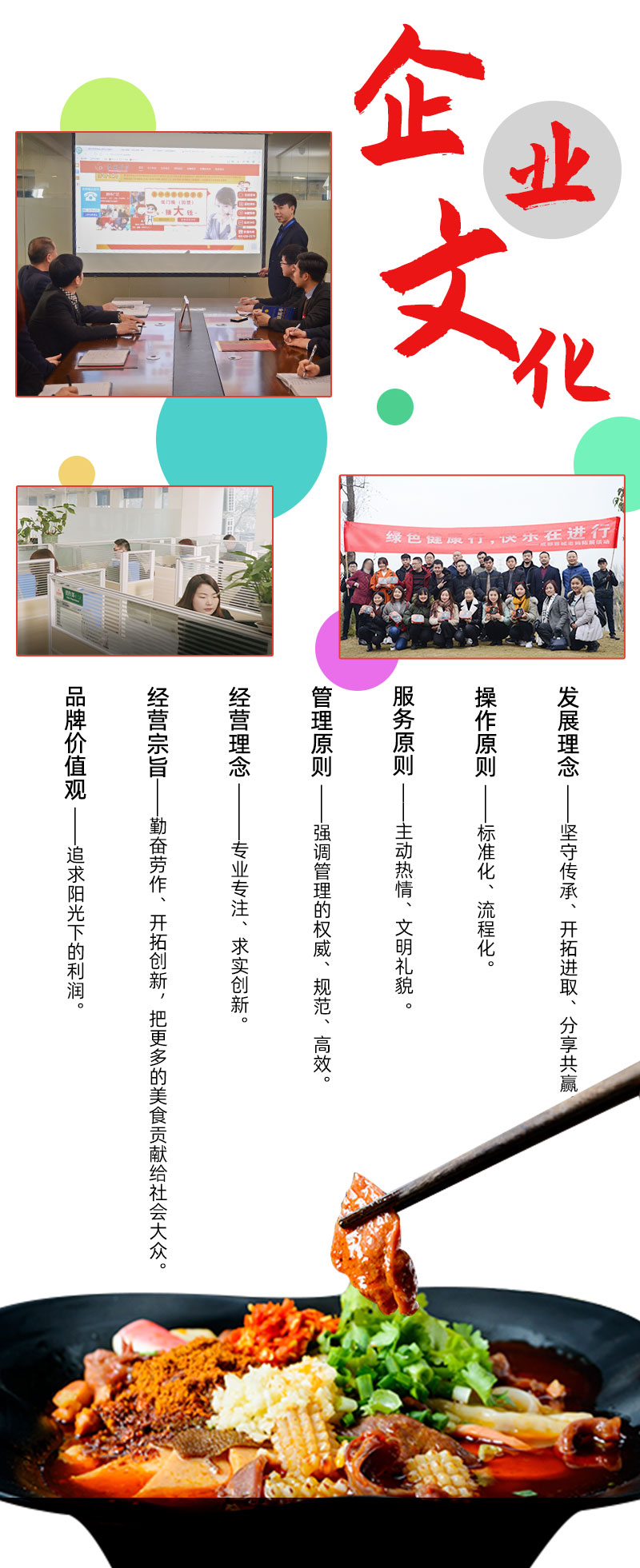 成都蓉城傳奇新派冒菜加盟全力打造出以健康、時尚、快樂每一餐為主題的新餐飲品牌。使用時尚清新的裝修風格,結合成都特色飲食,別具特色。在菜品及味道上用料上乘,取材廣泛,綠色健康,加上資深的火鍋冒菜名廚,用傳統的冒菜制作工藝,打造出了其色澤紅亮、麻辣鮮香、口味醇厚、回味悠長的火鍋冒菜加盟品牌。